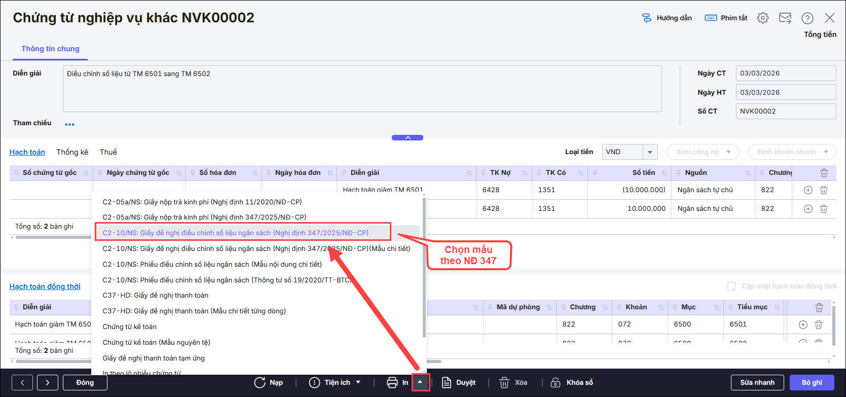 Nếu cần hiển thị chi tiết nội dung diễn giải đã nhập trên chứng từ thì chọn mẫu C2-10/NS Phiếu điều chỉnh số liệu ngân sách Nghị định 347/2025 (mẫu chi tiết)
