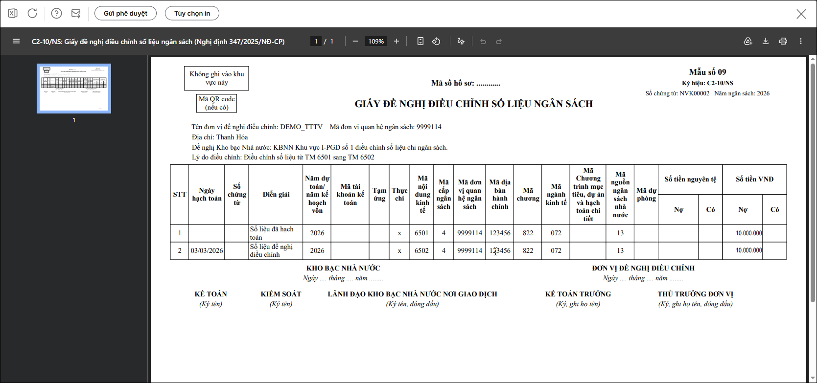 Bước 3 : Nhấn In\C2-10/NS: Phiếu điều chỉnh số liệu ngân sách Nghị định 347/2025