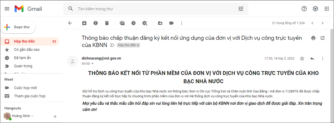 Cách 1: Kiểm tra email thông báo của KBNN trong Hộp thư đến.