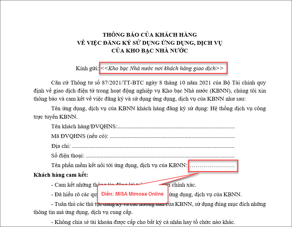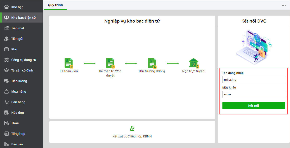 Để đăng ký sử dụng Kho bạc điện tử của MISA đơn vị lập & gửi phiếu đăng ký cho KBNN địa phương, KBNN địa phương sẽ tổng hợp danh sách gửi Cục CNTT KBNN TW để mở cổng kết nối cho đơn vị.