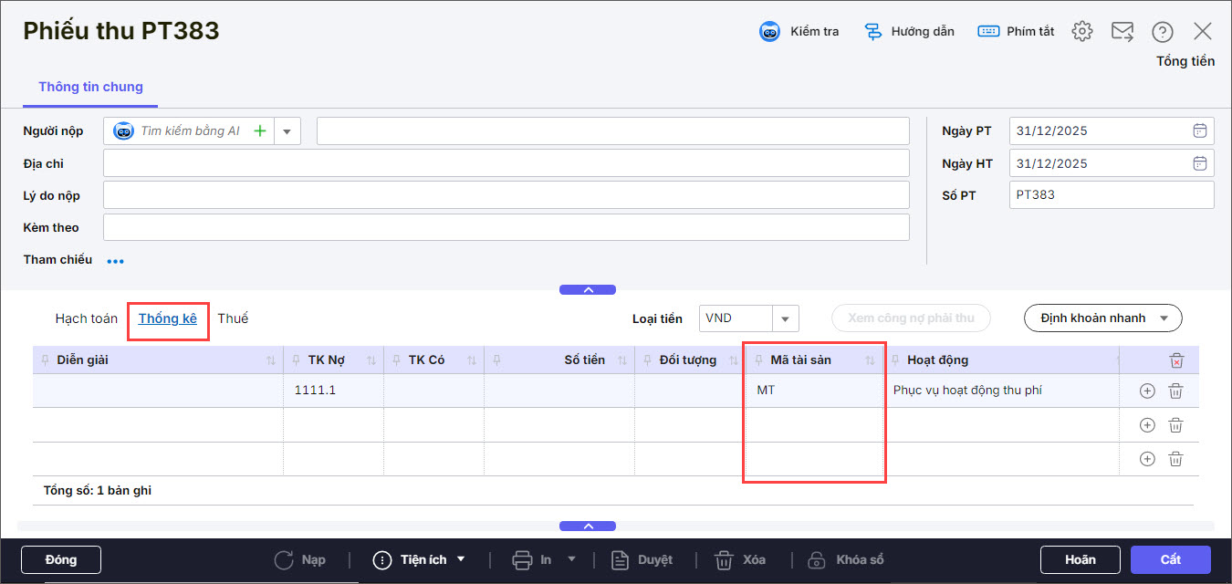Bài viết này hướng dẫn bạn có thể khai báo được Mã tài sản trên chứng từ Phiếu thu, Thu tiền gửi để theo dõi chi tiết số thu thanh lý theo từng tài sản.