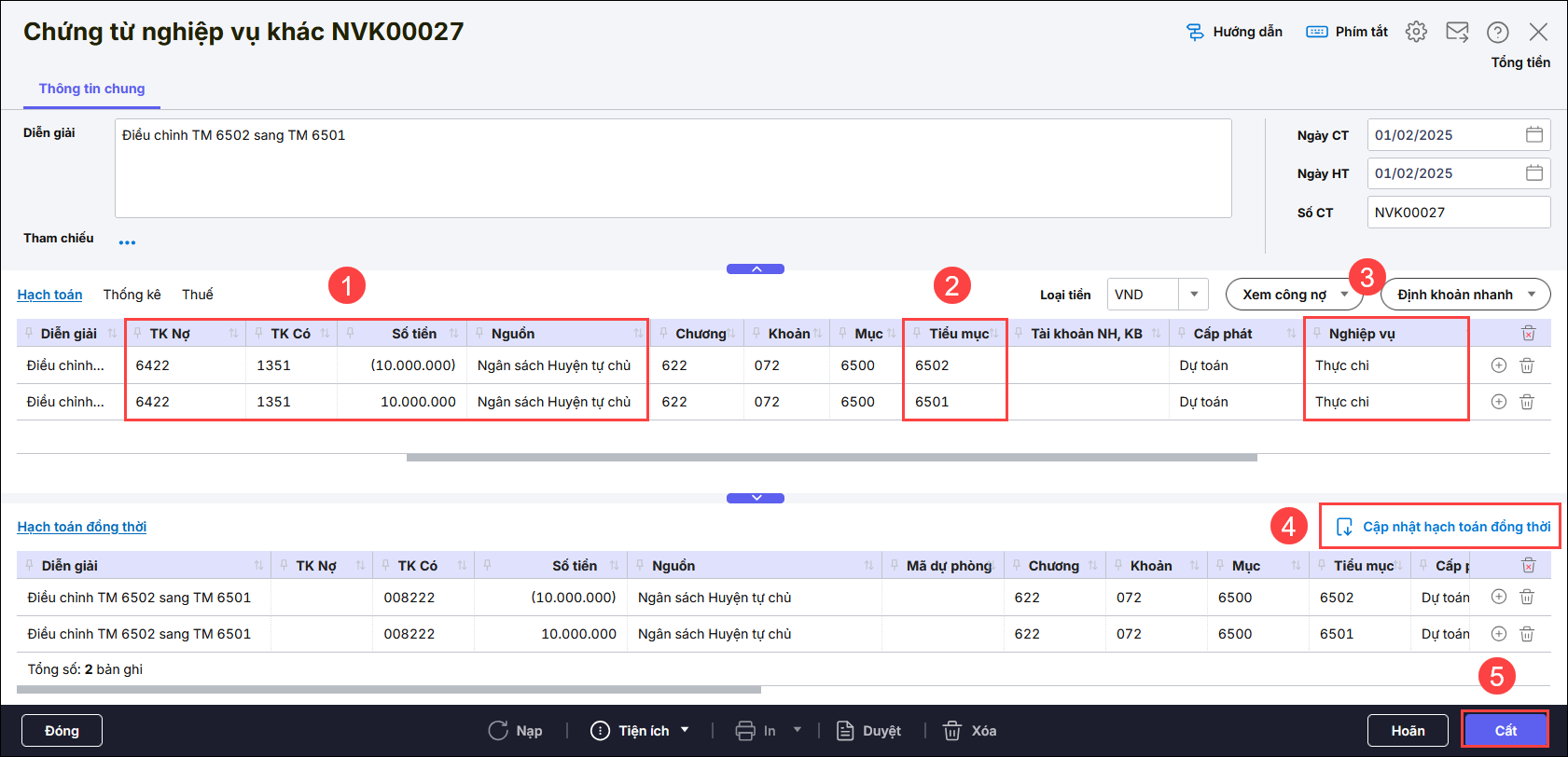 • Nợ TK 6422/Có TK 1351Số tiền âm 10.000.000tiểu mục 6502, nghiệp vụ chọn Thực chi