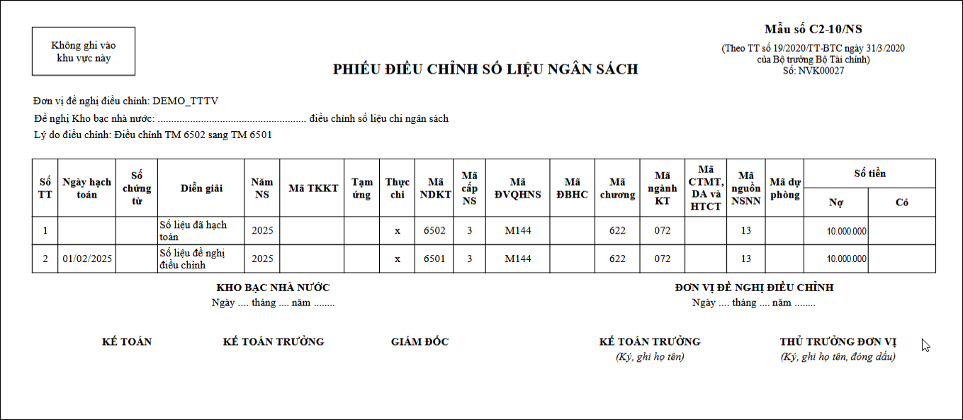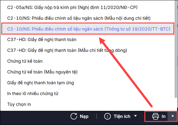 Bước 4: Nhấn In/chọn mẫu Phiếu điều chỉnh số liệu ngân sách (C2-10/NS) để làm thủ tục với Kho bạc