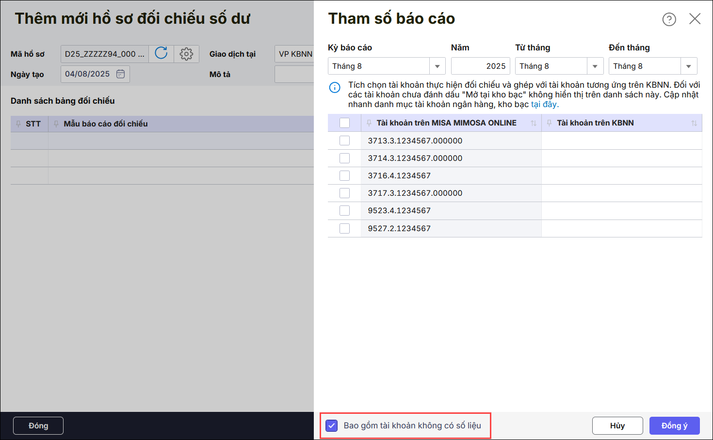 Bước 2: Tích chọn “Bao gồm tài khoản không có số liệu” => Cột Tài khoản Kho bạc trên MISA Mimosa sẽ lấy cả các tài khoản không có phát sinh để thực hiện ghép.