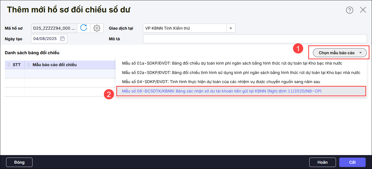 Bước 1: Khi lập hồ sơ đối chiếu số dư theo hướng dẫn tại đây, tại bước chọn mẫu báo cáo Mẫu số 06-ĐCSDTK/KBNN: Bảng xác nhận số dư tài khoản tiền gửi tại kho bạc nhà nước