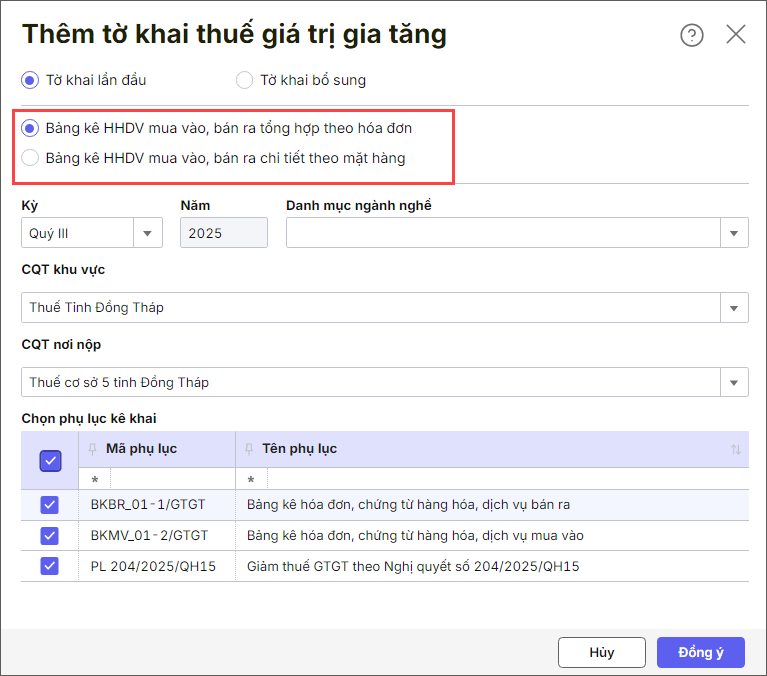 – Hiện nay: Khi thêm tờ khai thuế giá trị gia tăng, khi chọn Tờ khai lần đầu hoặc Tờ khai bổ sung, phần mềm bổ sung tích chọn: Bảng kê HHDV mua vào, bán ra tổng hợp theo hóa đơn hoặc Bảng kê HHDV mua vào, bán ra chi tiết theo mặt hàng.