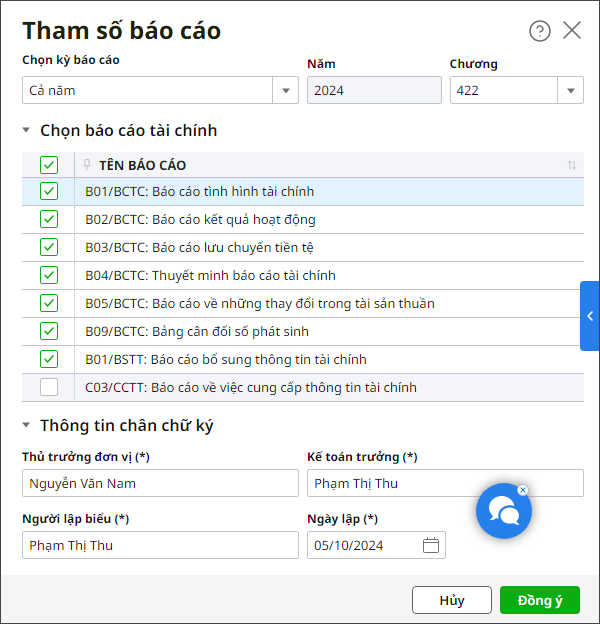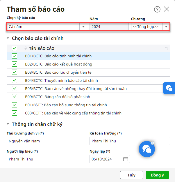LƯU Ý: Trường hợp cần lập báo cáo tài chính tổng hợp các chương thì chọn Kỳ báo cáo là Cả năm, Chương là Tổng hợp.