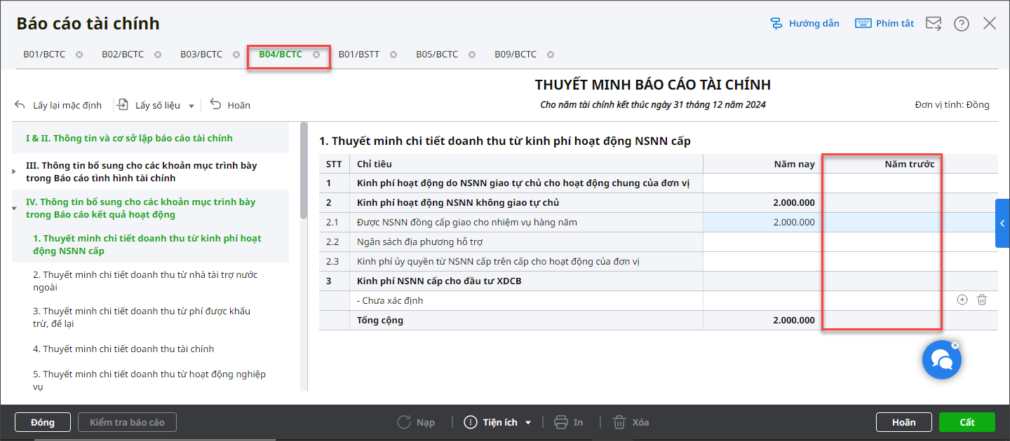 Bài viết hướng dẫn anh/chị cách nhập và hiển thị số liệu ở cột năm trước trên báo cáo Thuyết minh báo cáo tài chính (B04/BCTC) theo Thông tư 24/2024/TT-BTC, giúp báo cáo đầy đủ thông tin so sánh giữa các năm.