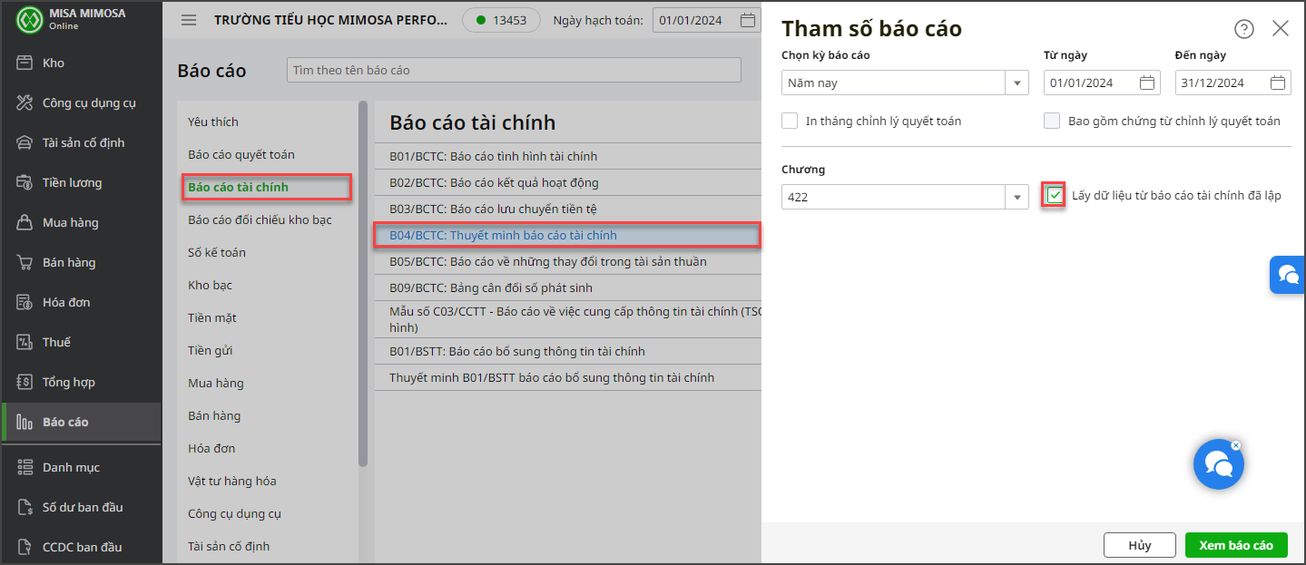 – Chọn báo cáo B04/BCTC: Thuyết minh báo cáo tài chính. Khai báo các tham số báo cáo.