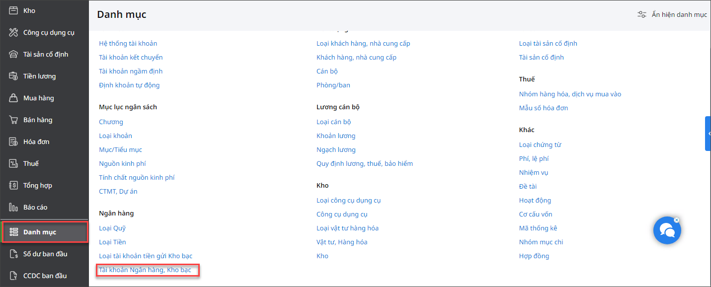 Bước 1: Vào Danh mục\Tài khoản ngân hàng, kho bạc