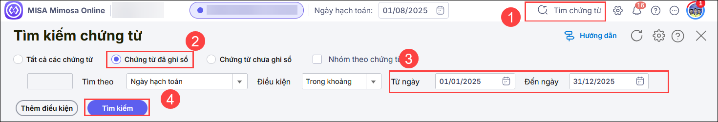 - Nhấn Tìm chứng từ, tích vào Chứng từ đã ghi sổ, chọn điều kiện tìm kiếm (là khoảng thời gian tìm đối chiếu dữ liệu)