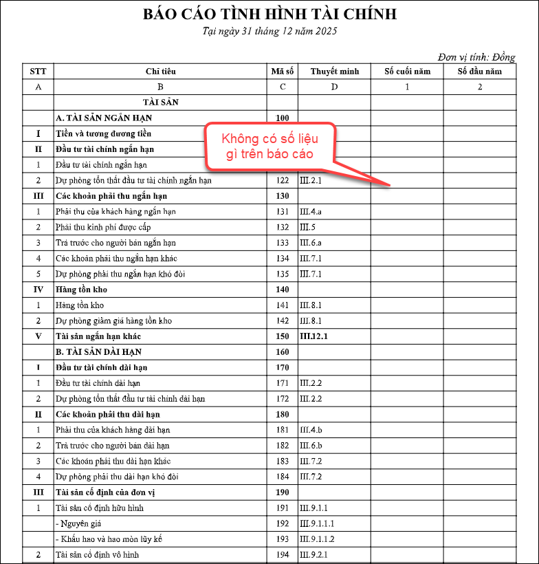 Bài viết này hướng dẫn anh/chị cách xử lý khi in Báo cáo tài chính không có số liệu (báo cáo trắng): B01/BCTC: Báo cáo tình hình tài chính, B02/BCTC: Báo cáo kết quả hoạt động, B03/BCTC: Báo cáo lưu chuyển tiền tệ, B04/BCTC: Thuyết minh báo cáo tài chính