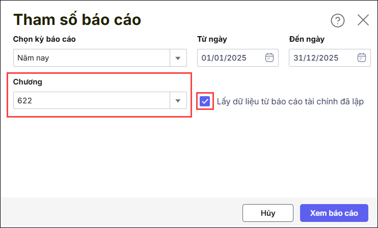 - Chọn năm, chương, chọn báo cáo cần lập. Tích Đồng ý