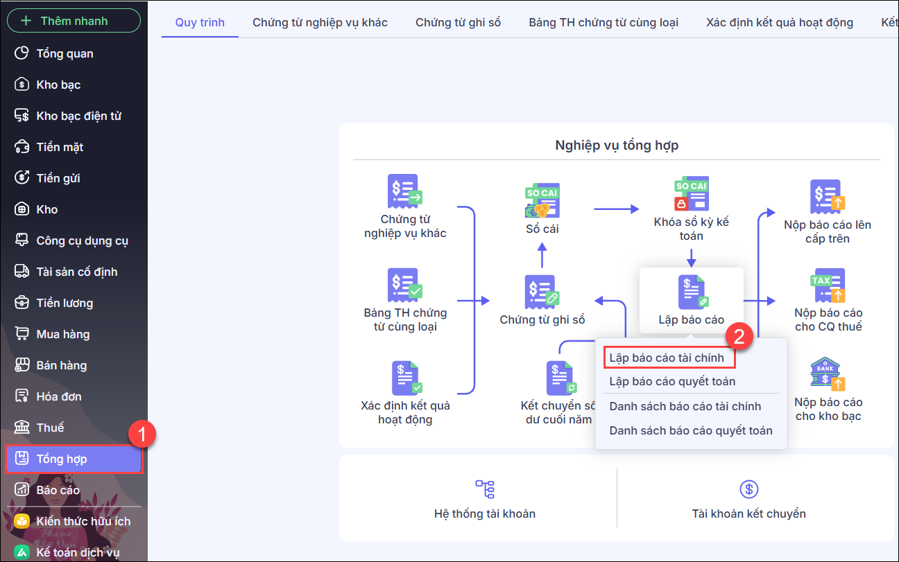 - Vào Tổng hợp\Lập báo cáo\Lập báo cáo tài chính