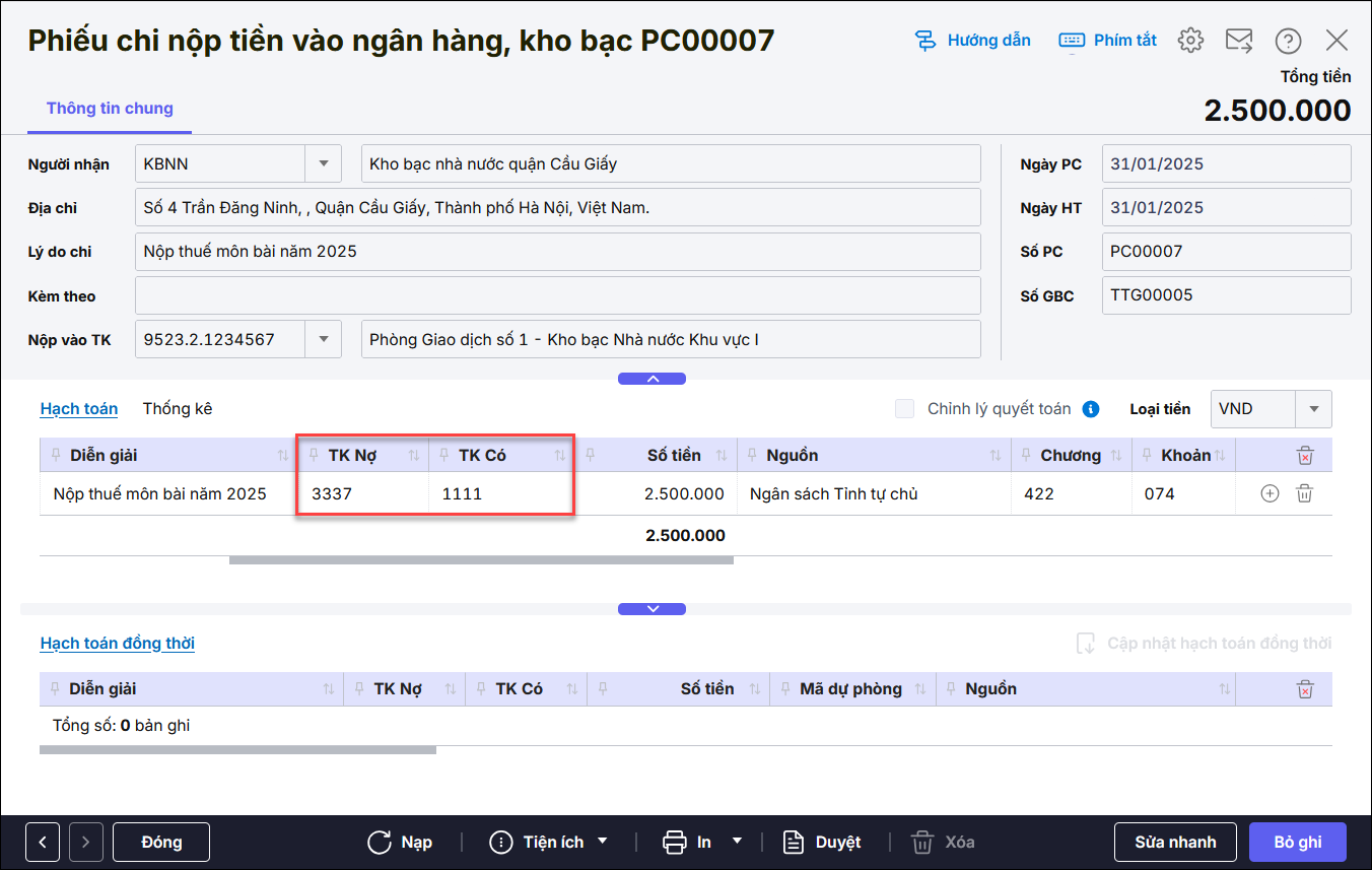 Bài viết hướng dẫn cách xử lý trường hợp in Giấy nộp tiền vào Ngân sách nhà nước (C1-02/NS) nhưng chứng từ trắng, không hiển thị số tiền hoặc thông tin đã nhập, nguyên nhân thường do chưa hạch toán đúng nghiệp vụ nộp phí lệ phí, nộp tiền thuế và NSNN.
