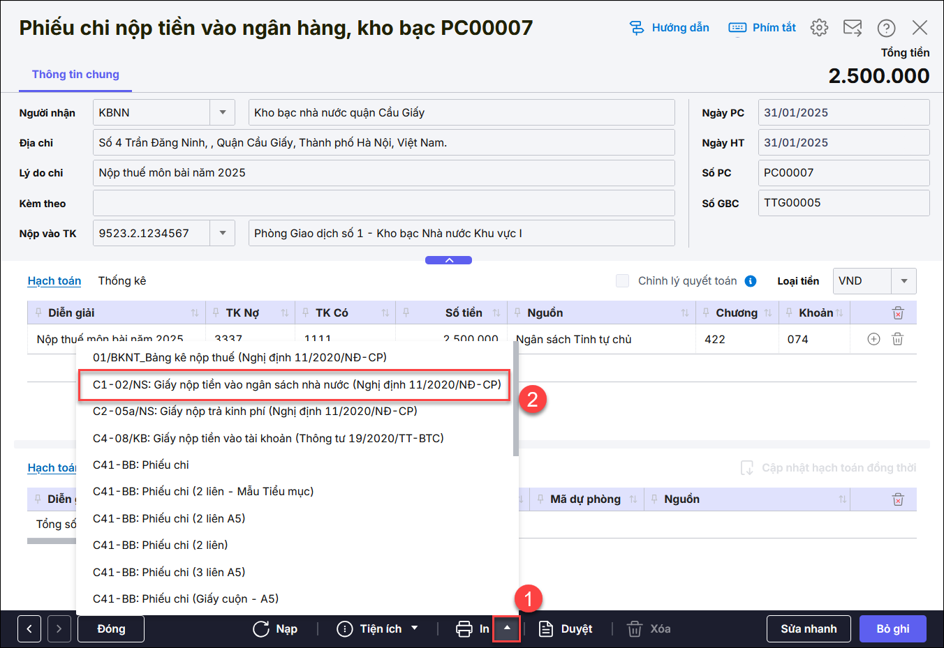 Tại giao diện phiếu chi nộp tiền vào ngân hàng, kho bạc, nhấn vào mũi tên cạnh In chọn mẫu Giấy nộp tiền vào Ngân sách nhà nước (C1-02/NS).