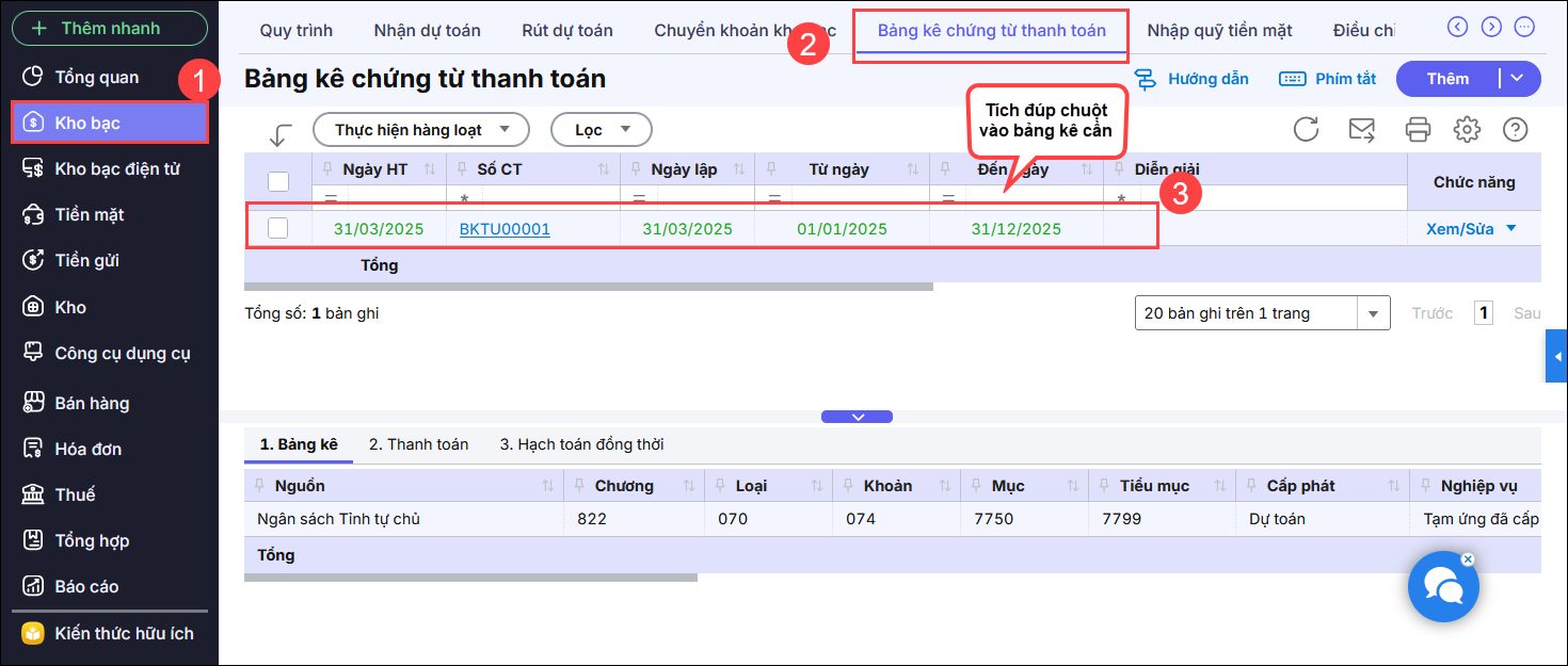 Bước 1: Vào Menu Kho bạc/Bảng kê chứng từ thanh toán, tích vào bảng kê đã thanh toán thực tế với Kho bạc