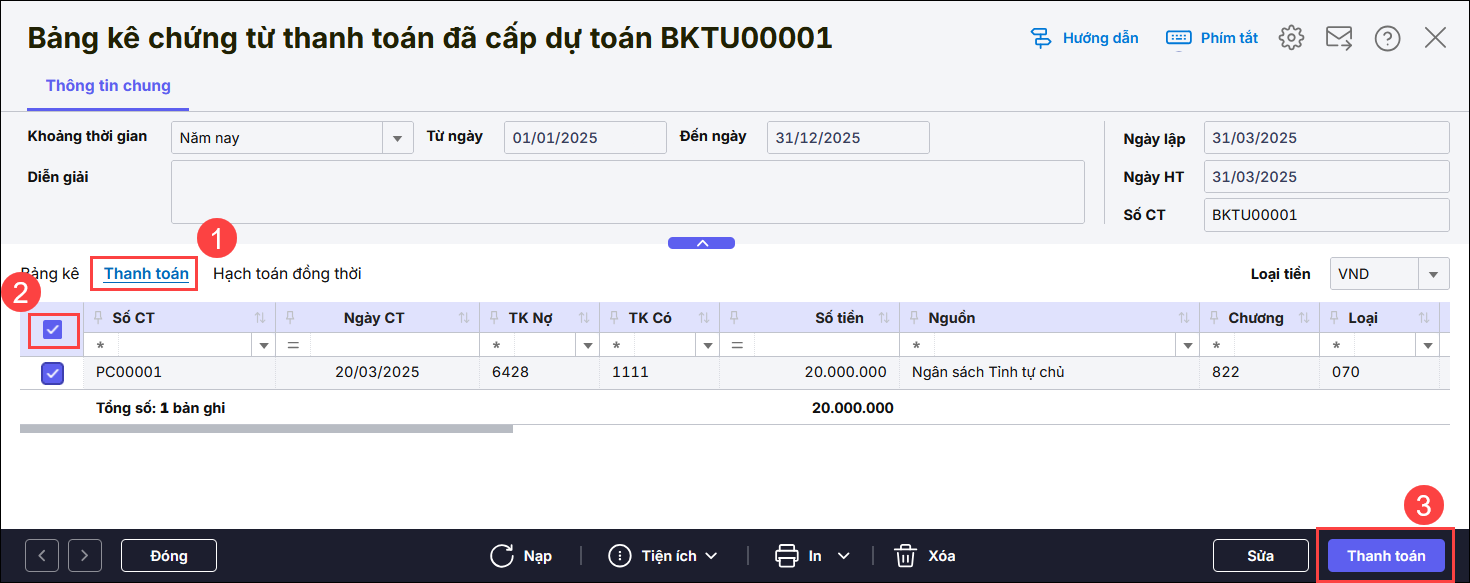 Bước 2: Tích vào tab Thanh toán, tích chọn chứng từ cần thanh toán. Tích Thanh toán