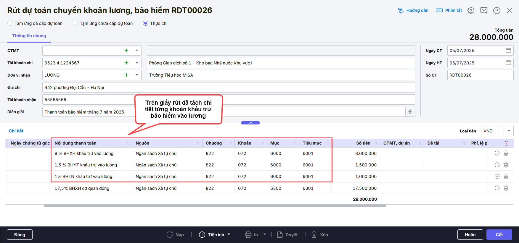 - Khi nhập giấy rút dự toán chuyển khoản bảo hiểm đã tách chi tiết đến từng khoản khấu trừ BHXH, BHYT, BHTN.