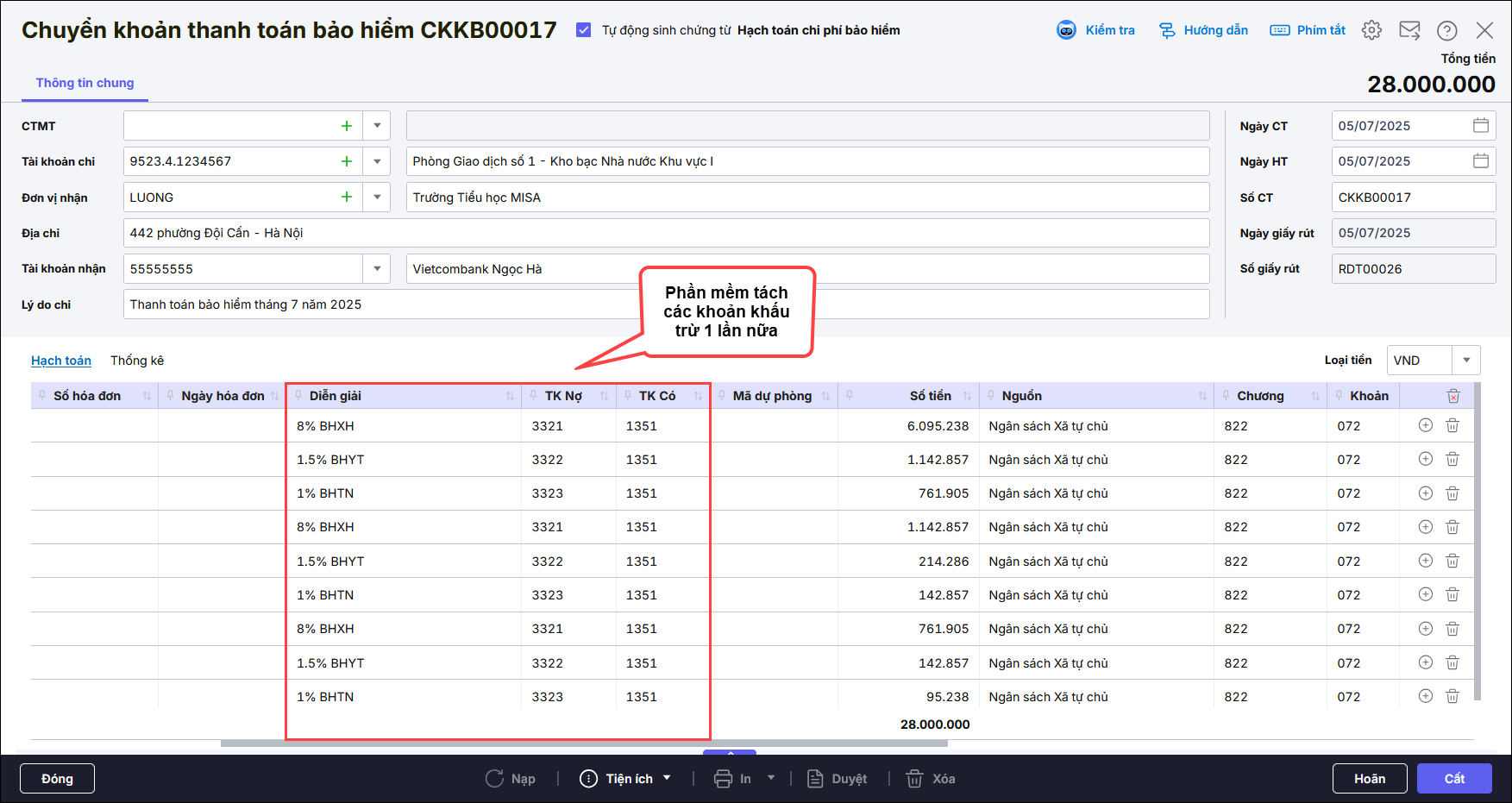 - Tuy nhiên, khi sinh chứng từ chuyển khoản bảo hiểm vẫn tự động hạch toán tách thành các khoản bảo hiểm khấu trừ vào lương thêm 1 lần nữa.