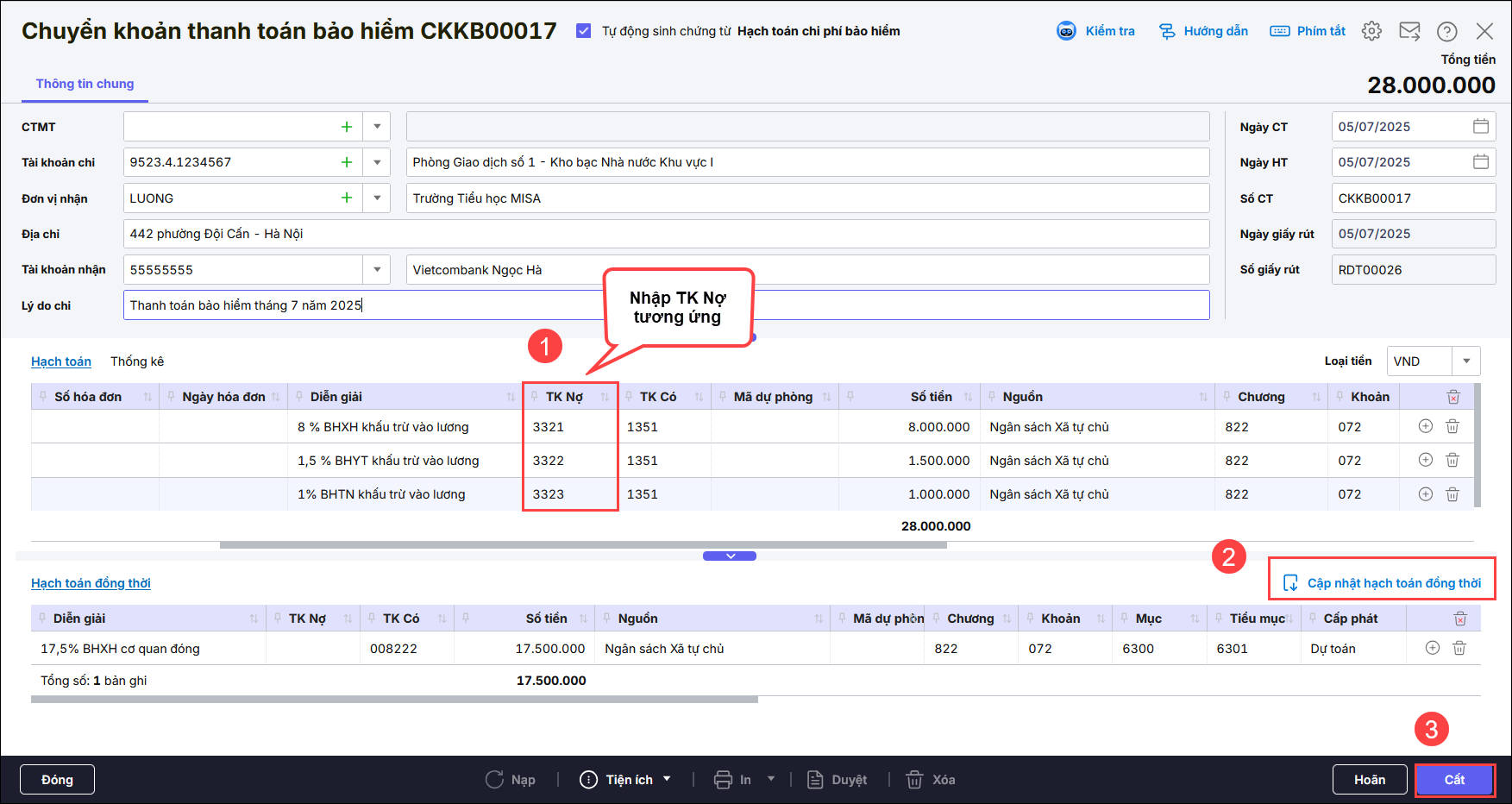 Bước 3: Bạn mở lại giấy rút dự toán chuyển khoản lương, bảo hiểm và sinh lại Chứng từ chuyển khoản thanh toán bảo hiểm, bạn bổ sung tài khoản Nợ tương ứng với từng khoản chi bảo hiểm.