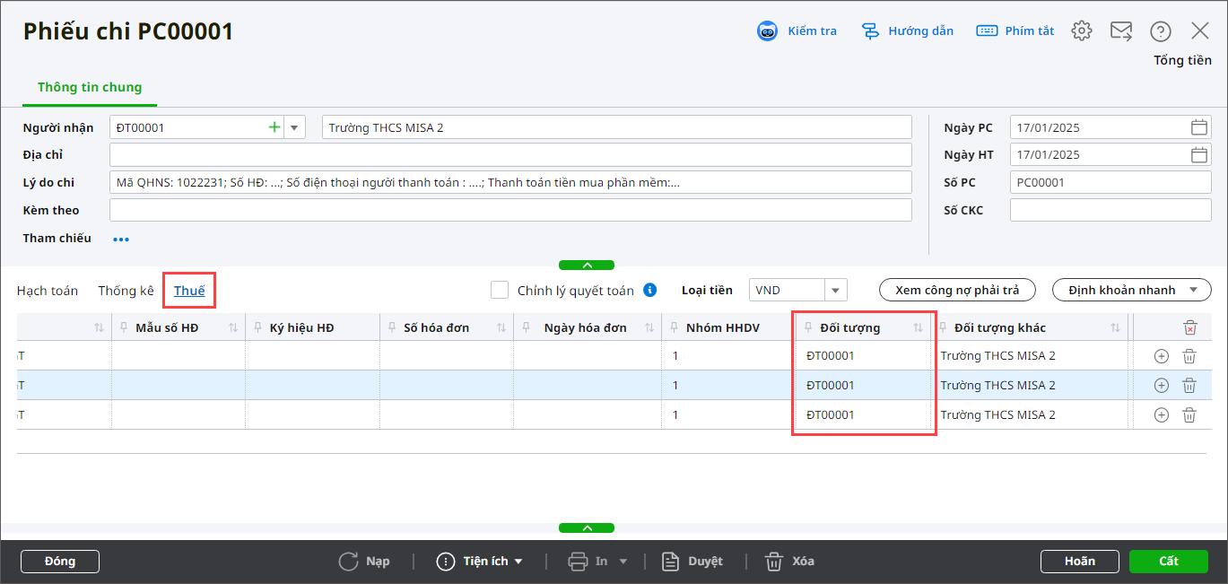 Khi lập Phiếu chi, kế toán có thể chọn được Đối tượng tại tab Thuế để làm việc nhanh hơn.