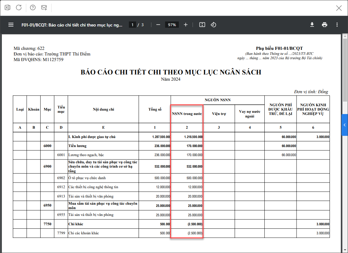 Bài viết hướng dẫn anh/chị cách xử lý khi in Báo cáo Phụ biểu F01-01/BCQT, số liệu tại Cột 2 – Ngân sách trong nước không lên đúng theo tiểu mục.