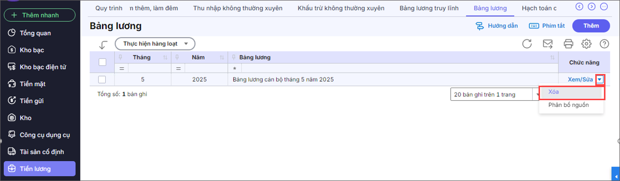Bước 2: Nhấn vào mũi tên cạnh Xem/Sửa chọn Xóa tại bảng lương cần xóa.