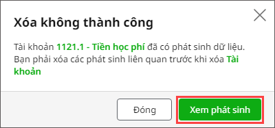 Trường hợp 2: Muốn xóa trong danh mụcTrường hợp danh mục cần xóa đã phát sinh dữ liệu, phần mềm sẽ hiển thị cảnh báo: