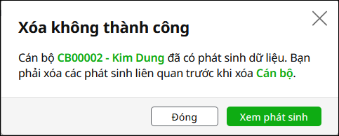 Khi xóa danh mục: Cán bộ, Khách hàng, Nhà cung cấp, Vật tư…phần mềm báo “…đã có phát sinh dữ liệu. Bạn phải xóa các phát sinh liên quan trước khi xóa…”.