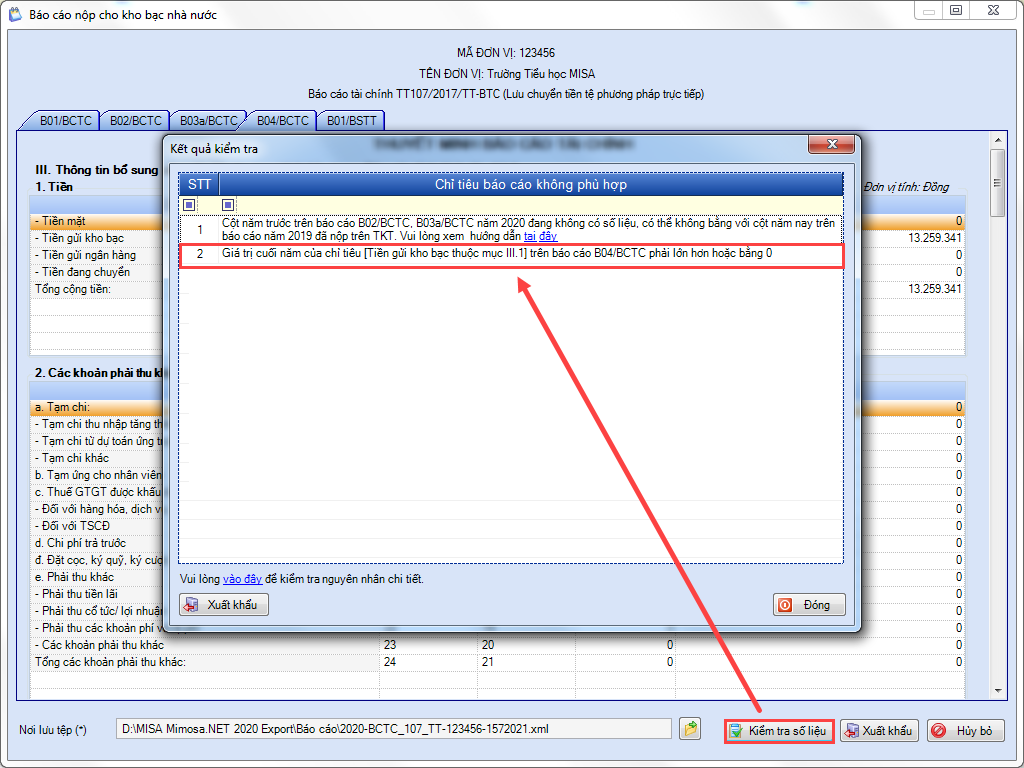 Khi xuất khẩu BCTC nộp cho KBNN phần mềm báo Các chỉ tiêu không phù hợp “Giá trị cuối năm của chỉ tiêu [Tiền gửi kho bạc thuộc mục III.3] trên báo cáo B04/BCTC phải lớn hơn hoặc bằng 0″
