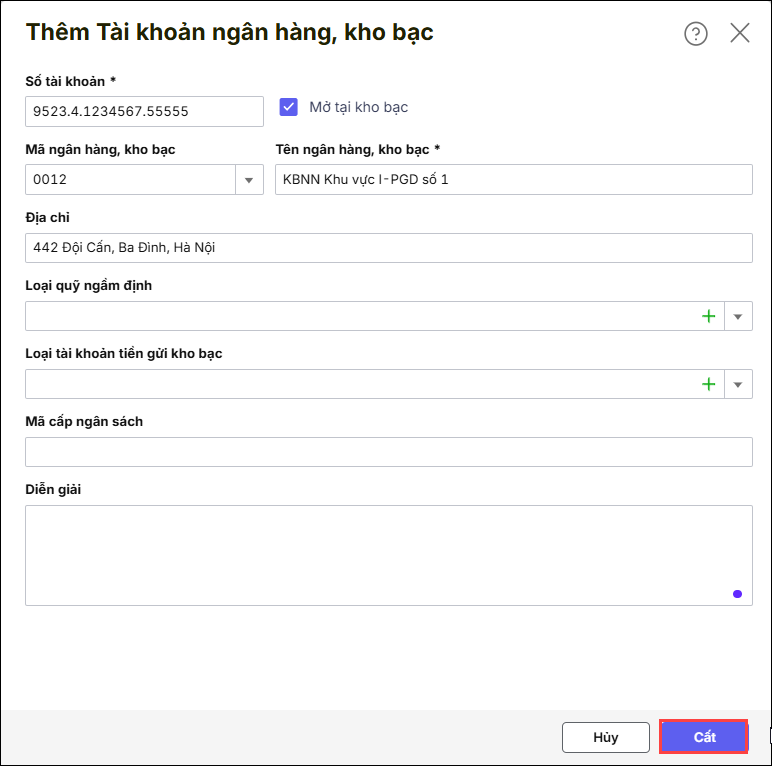 - Khai báo các thông tin bổ sung (nếu cần) như: Địa chỉ, Loại quỹ ngầm định, Loại tài khoản tiền gửi, Mã cấp ngân sách…