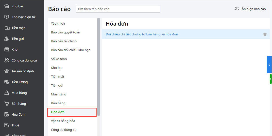 Bước 1: Vào menu Báo cáo\Hóa đơn\Đối chiếu chi tiết chứng từ bán hàng và hóa đơn.