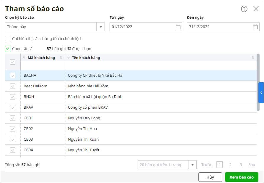- Tích chọn các khách hàng cần xem báo cáo hoặc tích chọn Tất cả khách hàng để xem báo cáo.