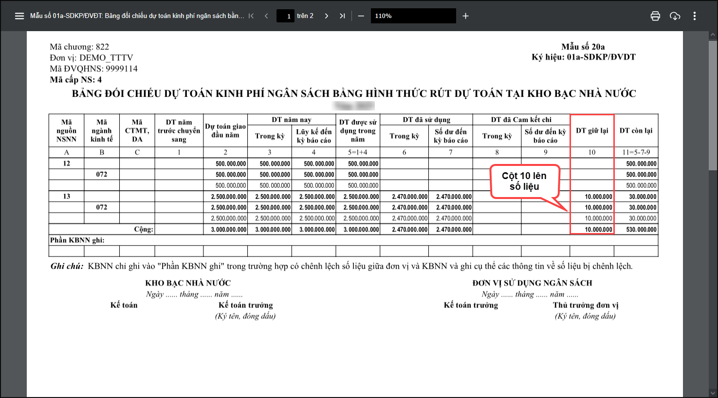 Bước 5: In Báo cáo đối chiếu kho bạc chọn báo cáo 01a-SDKP/ĐVDT (mẫu số 20a) để xem số liệu. Báo cáo sẽ lấy số liệu lên cột Dự toán giữ lại (cột số 10)