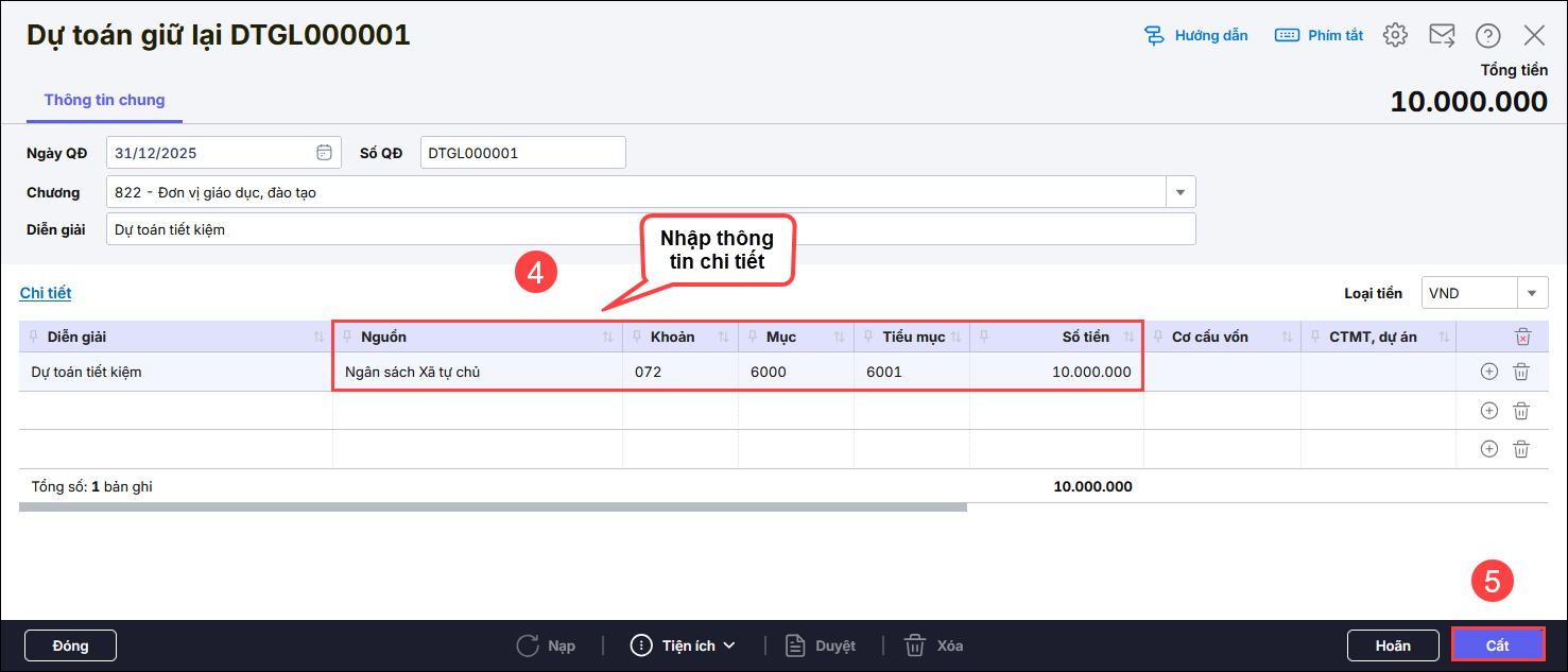 - Nhập các thông tin bắt buộc: Nguồn, Khoản, Số tiền