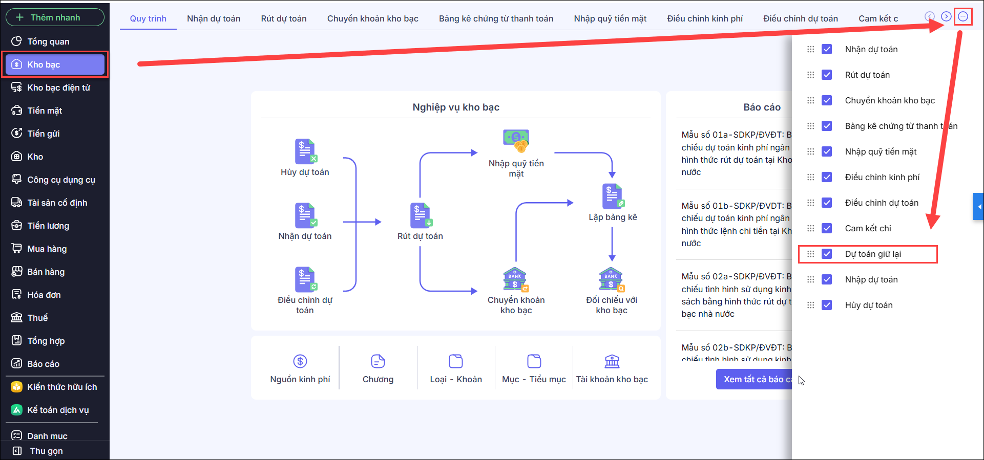 Nếu không thấy tab Dự toán giữ lại trên màn hình, anh/chị có thể nhấn vào biểu tượng … Menu mở rộng ở góc trên bên phải, cùng dòng với danh sách nghiệp vụ và nhấn chuột vào Dự toán giữ lại.