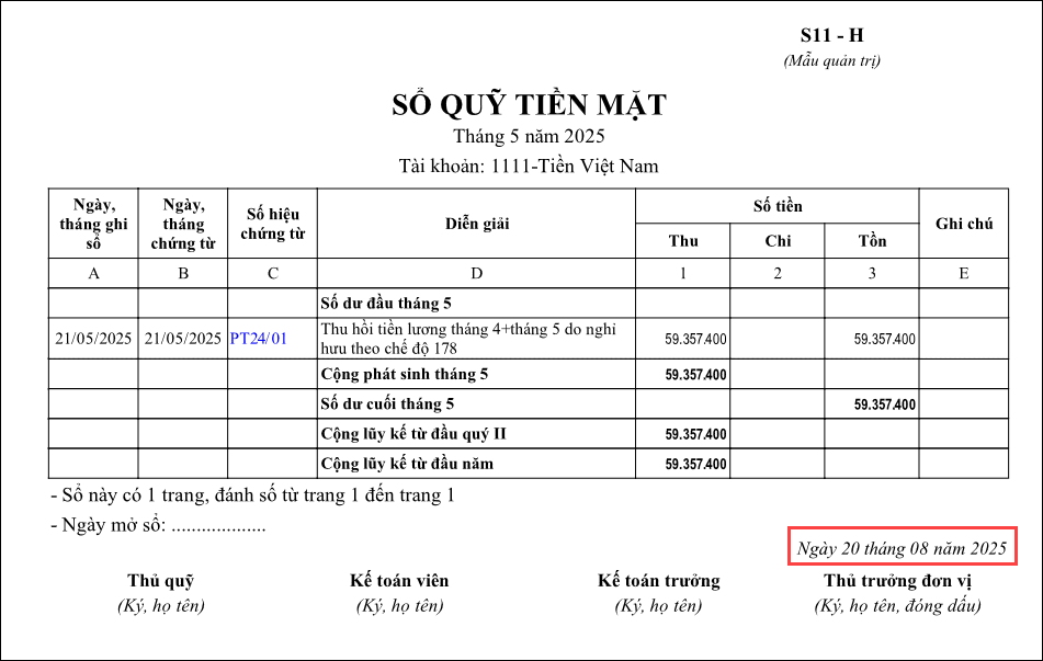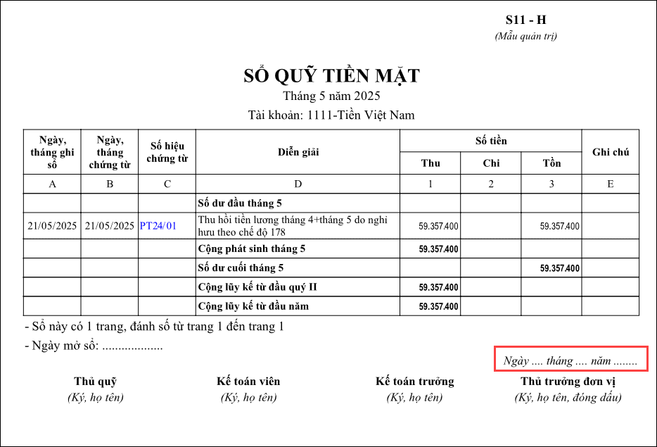 Khi in báo cáo ví dự như Sổ quỹ tiền mặt, phần ngày tháng năm dưới chân chữ ký đang hiển thị theo ngày Hạch toán, để bỏ trống không hiện thông tin này anh/chị làm như sau: