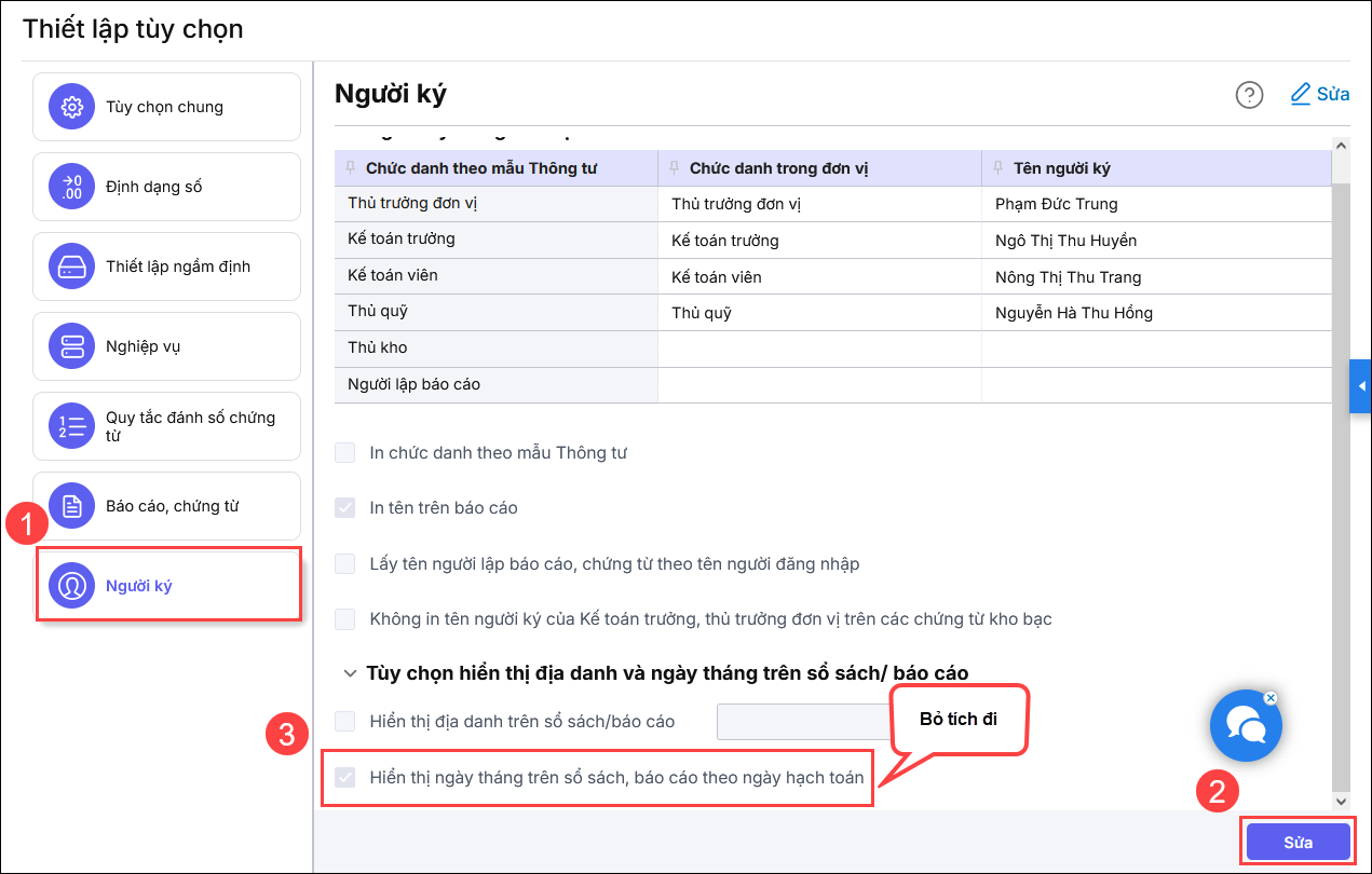 Bước 2: Chọn mục Người ký\ nhấn Sửa và bỏ tích ô Hiển thị ngày tháng trên sổ sách, báo cáo theo ngày hạch toán
