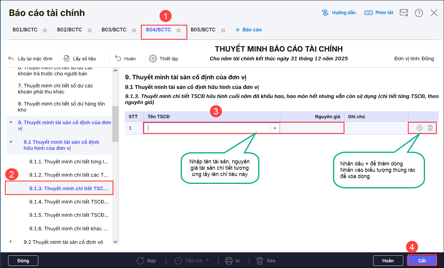 Bước 3: Chọn tab báo cáo B04/BCTC, chọn chỉ tiêu cần nhập, ví dụ III.9.1.3
