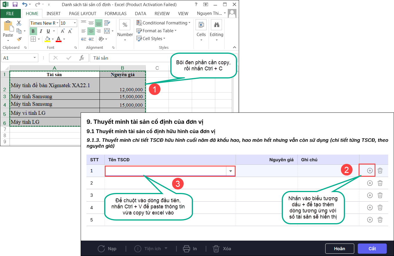 Lưu ý: Có thể nhập tay từng tài sản hoặc thêm dòng trống tương ứng với số tài sản sẽ hiển thị trên chỉ tiêu đang nhập rồi copy từ excel, paste vào phần mềm để nhập nhanh.