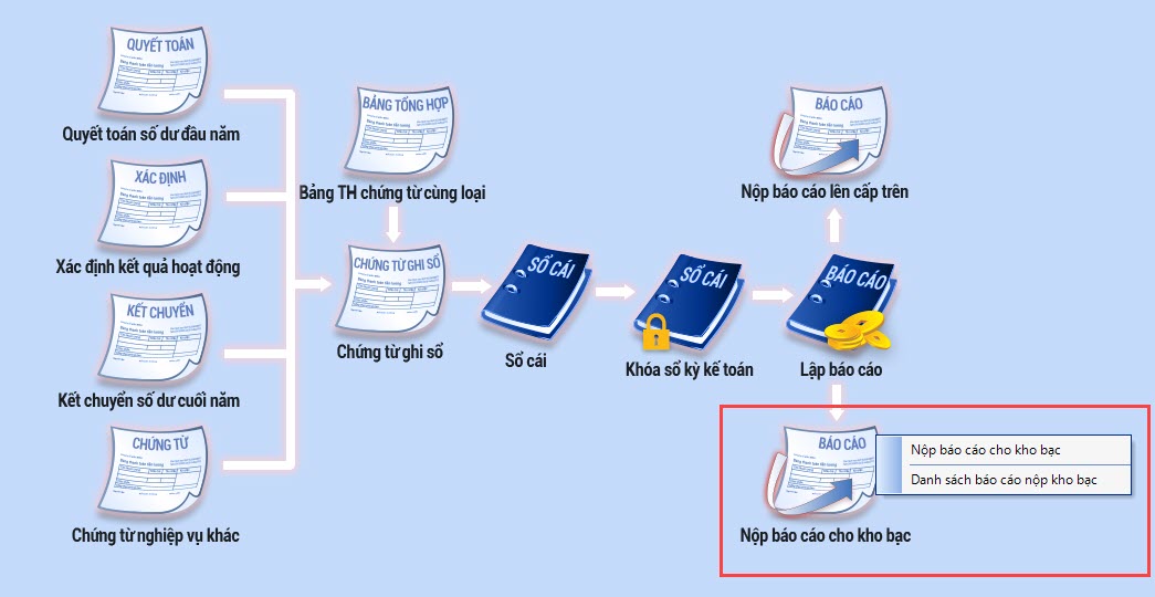 hoặc vào phân hệ Tổng hợp\Nộp báo cáo cho kho bạc.