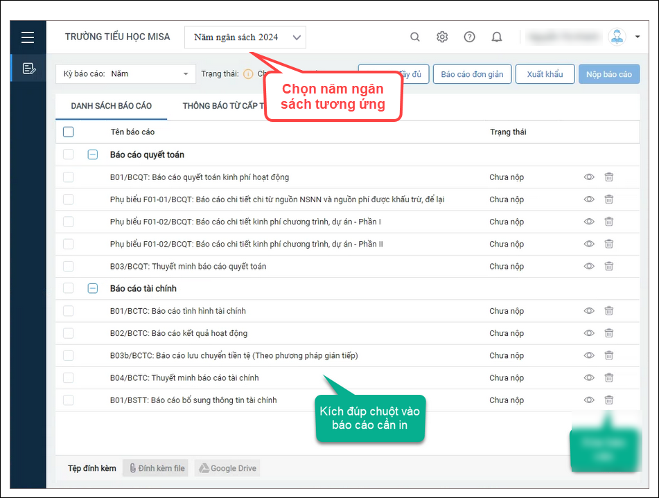 Bước 2: Chọn năm ngân sách cần in báo cáo. Ví dụ chọn năm ngân sách 2024