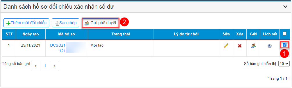 • Tìm kiếm hồ sơ NSD muốn in mẫu đối chiếu hoặc Gửi phê duyệt