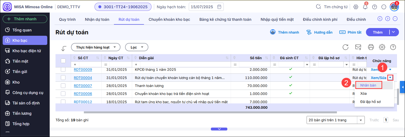 Bước 1: Vào Kho bạc\Rút dự toán Bước 2: Nhấn chuột vào biểu tượng mũi tên tại dòng chứng từ cần sao chép, chọn Nhân bản.