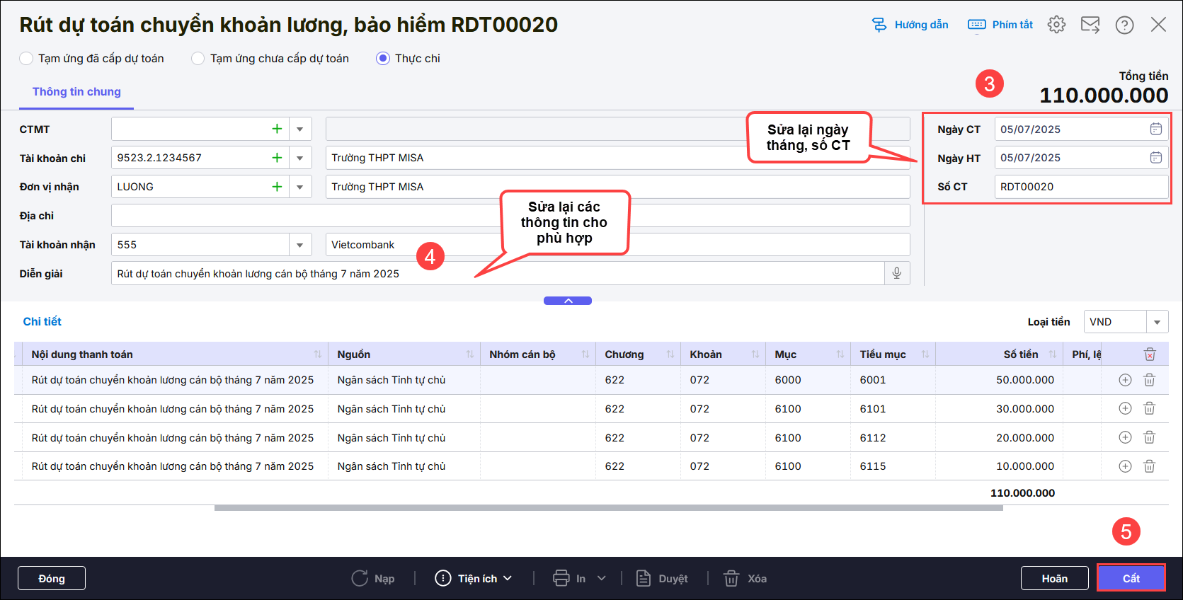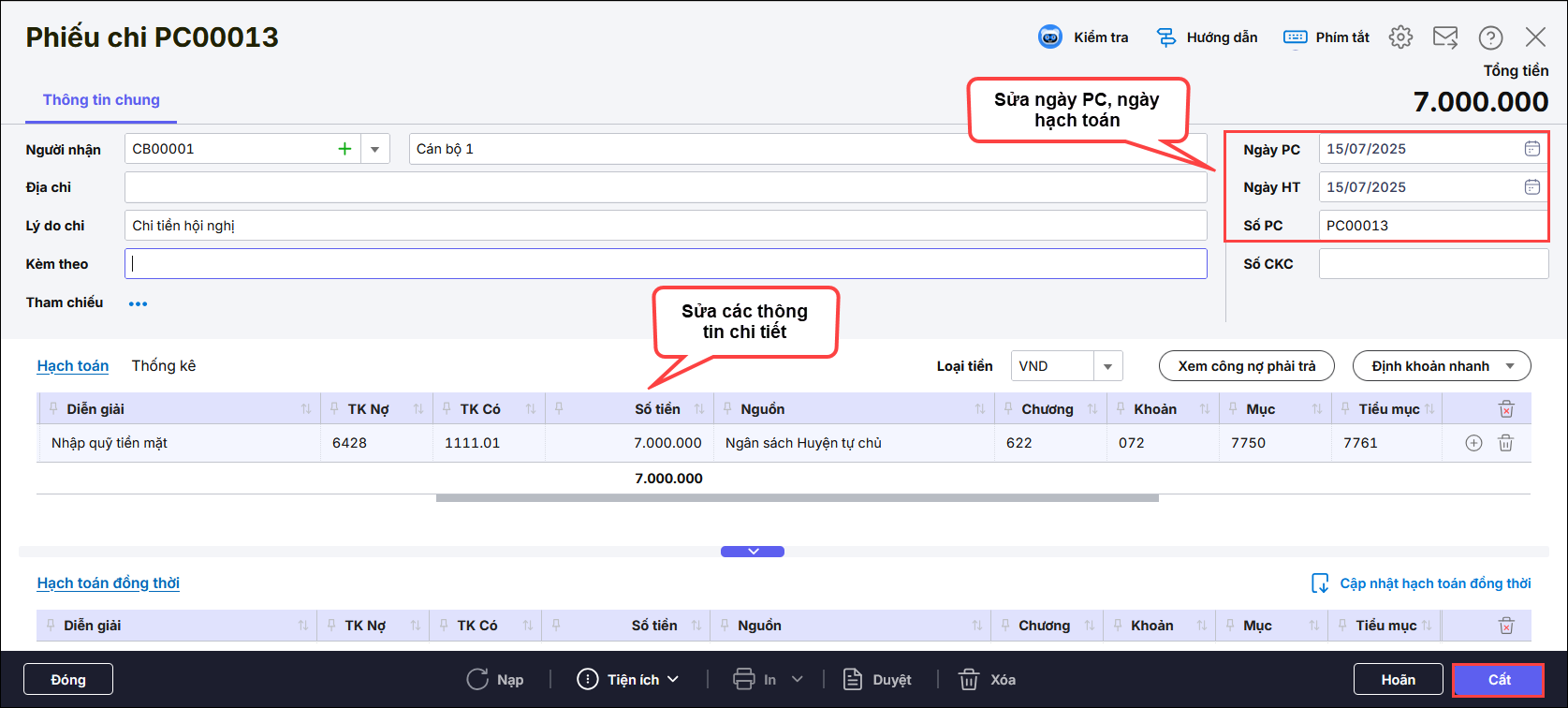 Bước 3: Trên chứng từ vừa được nhân bản lên, anh/chị sửa lại nội dung, ngày hạch toán và ngày chứng từ, số CT, thông tin chi tiết trên chứng từ cho phù hợp Bước 4: Nhấn Cất.