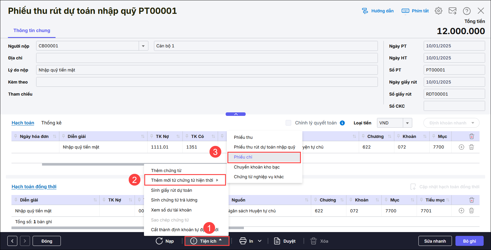 Bước 5: Nhấn Cất Lưu ý: Anh/chị cũng có thể sao chép từ 1 chứng từ khác loại bằng cách sau: Ví dụ cần tạo ra phiếu chi từ phiếu thu đã có.