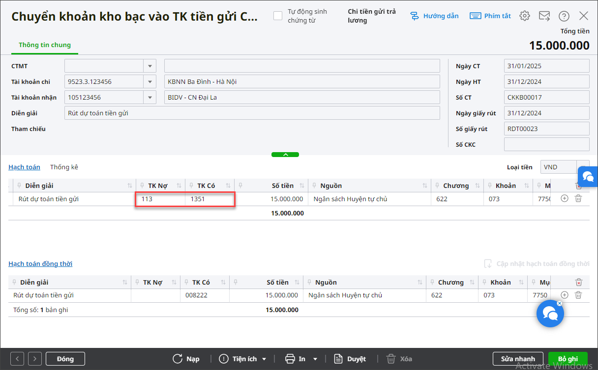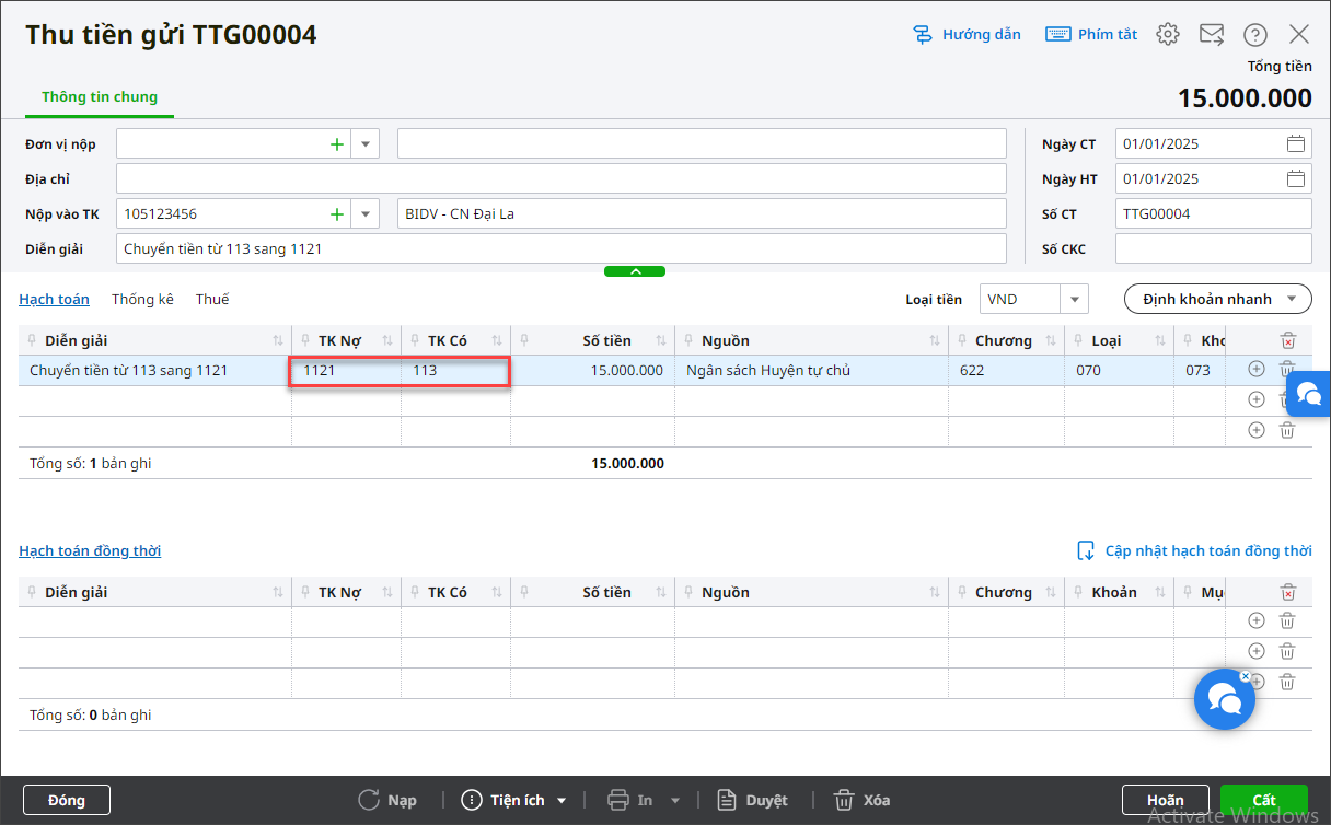 - Hạch toán Nợ TK 1121/Có TK 113, chọn tài khoản ngân hàng, kho bạc đơn vị trích lập quỹ ở đó, ngày hạch toán trong năm 2025