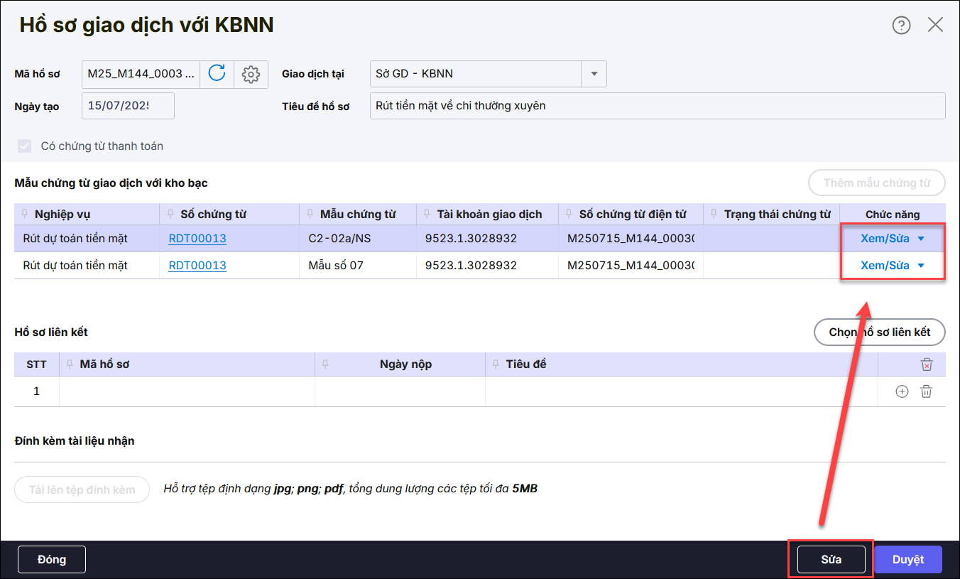 Bước 3. Nhấn Xem/Sửa tại hồ sơ cần sửa lại nội dung thanh toán.