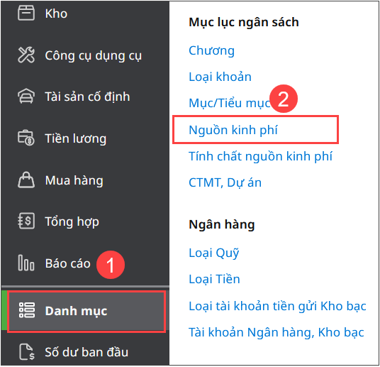 2.2. Khai báo Nguồn cải cách tiền lương (14)Bước 1: Vào Danh mục\Nguồn kinh phí.